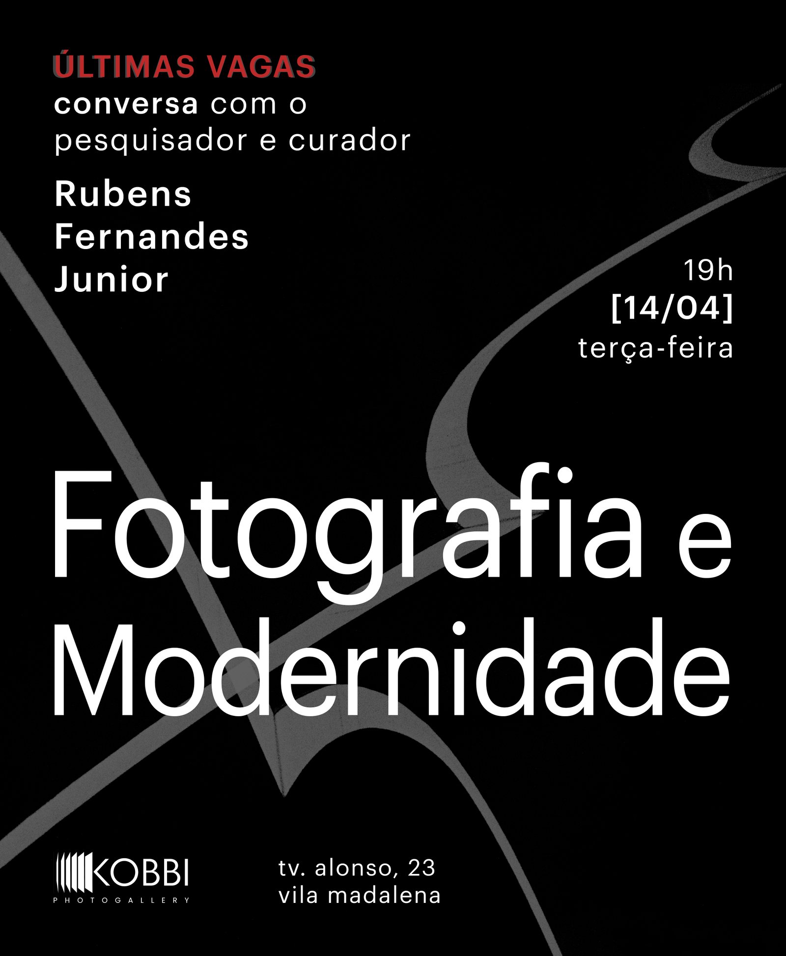 No dia 14 de abril, às 19h, a Kobbi Gallery recebe o pesquisador e curador Rubens Fernandes Junior para a palestra 𝘍𝘰𝘵𝘰𝘨𝘳𝘢𝘧𝘪𝘢 𝘦 𝘔𝘰𝘥𝘦𝘳𝘯𝘪𝘥𝘢𝘥𝘦.
